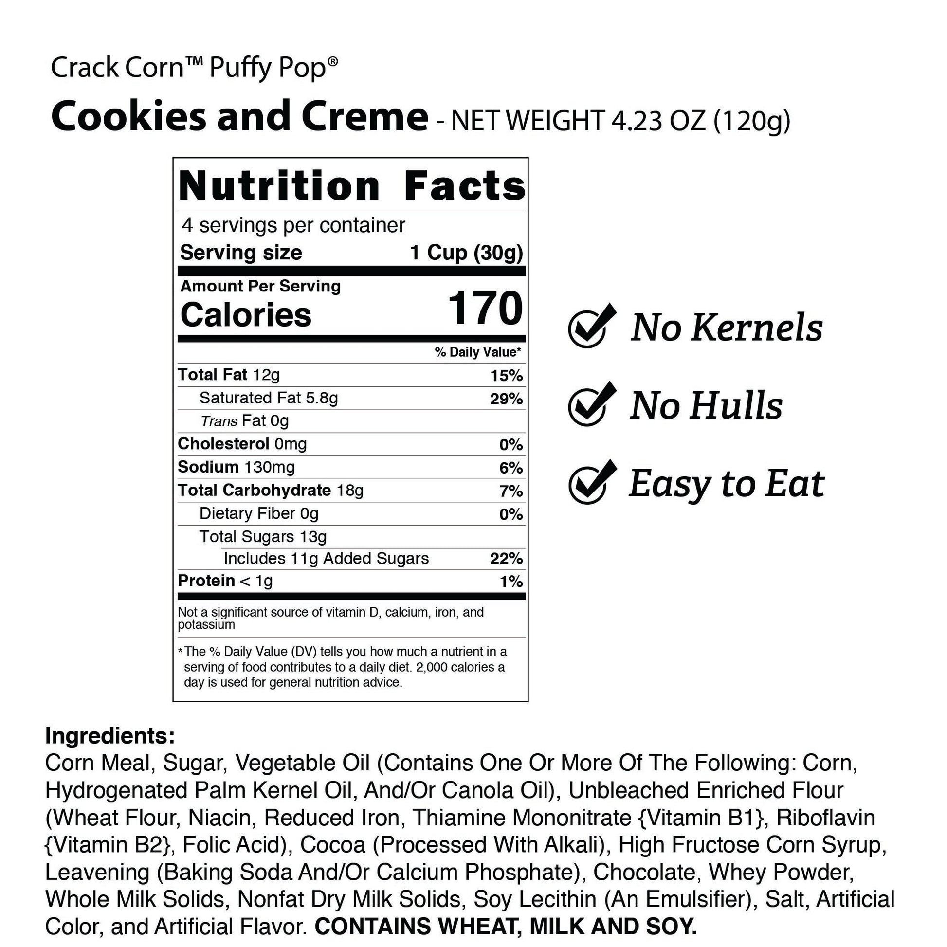 Corn Meal, Sugar, Vegetable Oil (Contains One Or More Of The Following: Corn, Hydrogenated Palm Kernel Oil, And/Or Canola Oil), Unbleached Enriched Flour (Wheat Flour, Niacin, Reduced Iron, Thiamine Mononitrate {Vitamin B1}, Riboflavin {Vitamin B2}, Folic Acid), Cocoa (Processed With Alkali), High Fructose Corn Syrup, Leavening (Baking Soda And/Or Calcium Phosphate), Chocolate, Whey Powder, Whole Milk Solids, Nonfat Dry Milk Solids, Soy Lecithin (An Emulsifier), Salt, Artificial Color, and Artificial Flavor. CONTAINS WHEAT, MILK AND SOY.