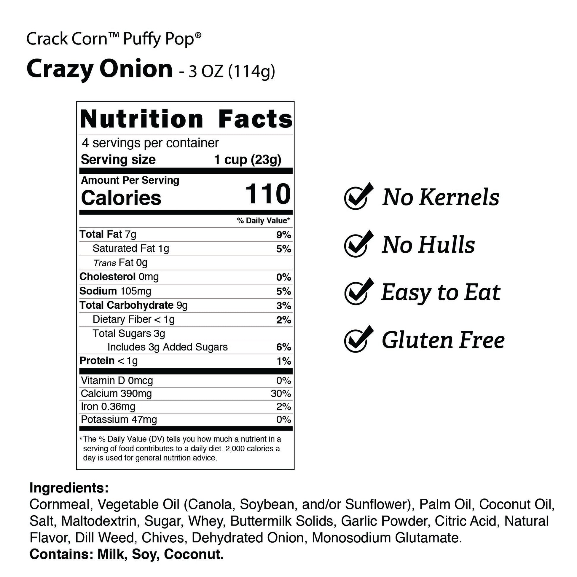 Cornmeal, Vegetable Oil (Canola, Soybean, and/or Sunflower), Palm Oil, Coconut Oil, Salt, Maltodextrin, Sugar, Whey, Buttermilk Solids, Garlic Powder, Citric Acid, Natural Flavor, Dill Weed, Chives, Dehydrated Onion, Monosodium Glutamate. Contains: Milk, Soy, Coconut.