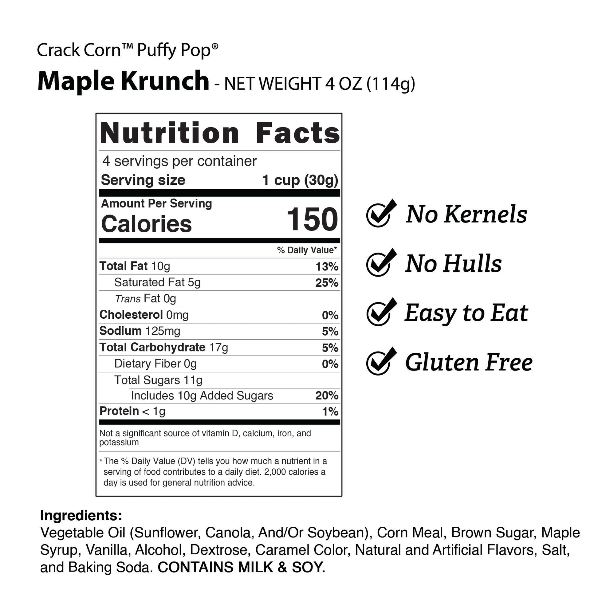 Vegetable Oil (Sunflower, Canola, And/Or Soybean), Corn Meal, Brown Sugar, Maple Syrup, Vanilla, Alcohol, Dextrose, Caramel Color, Natural and Artificial Flavors, Salt, and Baking Soda. CONTAINS MILK AND SOY.